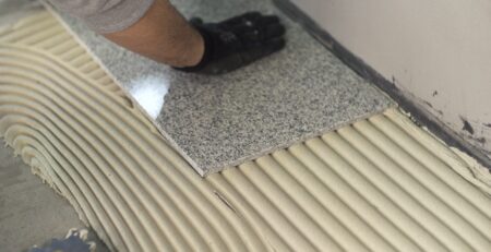 - Dụng cụ thi công: Dùng bay ( bàn kéo răng cưa ), búa cao su, ke cân bằng…